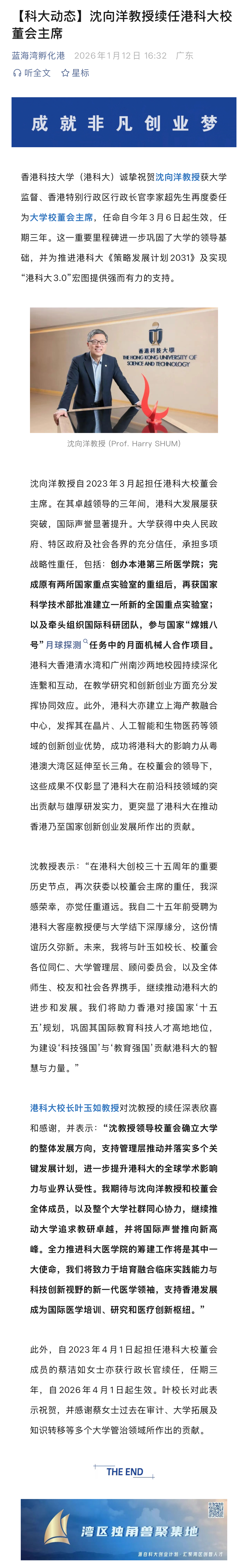 沈向洋教授续任港科大校董会主席